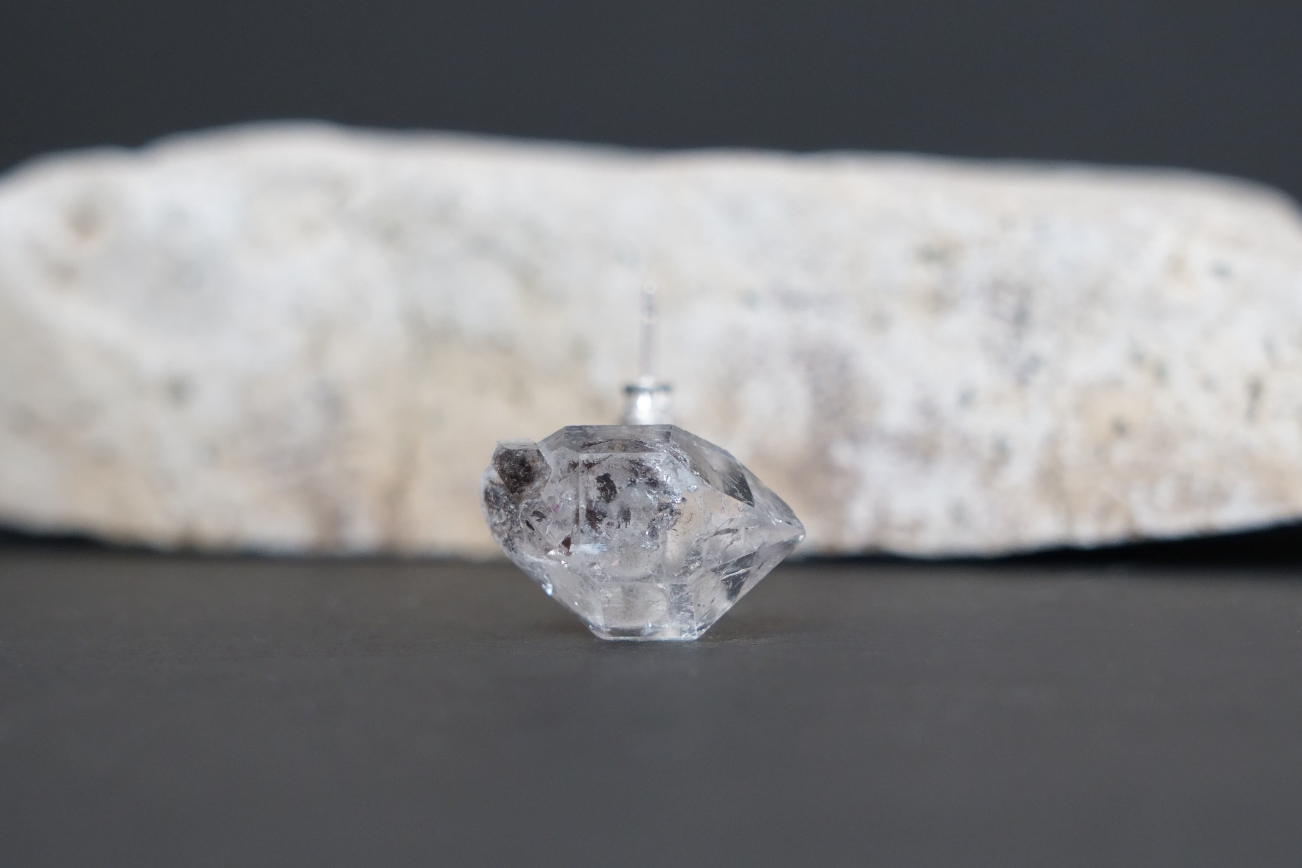 こちらはパキスタンで産出された両錐型の結晶ですがハーキマーダイヤモンドに劣らぬ透明度と品質のためパキスタンハーキマーと呼ばれています。内部に見える黒い物はカーボン(炭素)です。内包物を様々な角度から楽しめるのも魅力です。