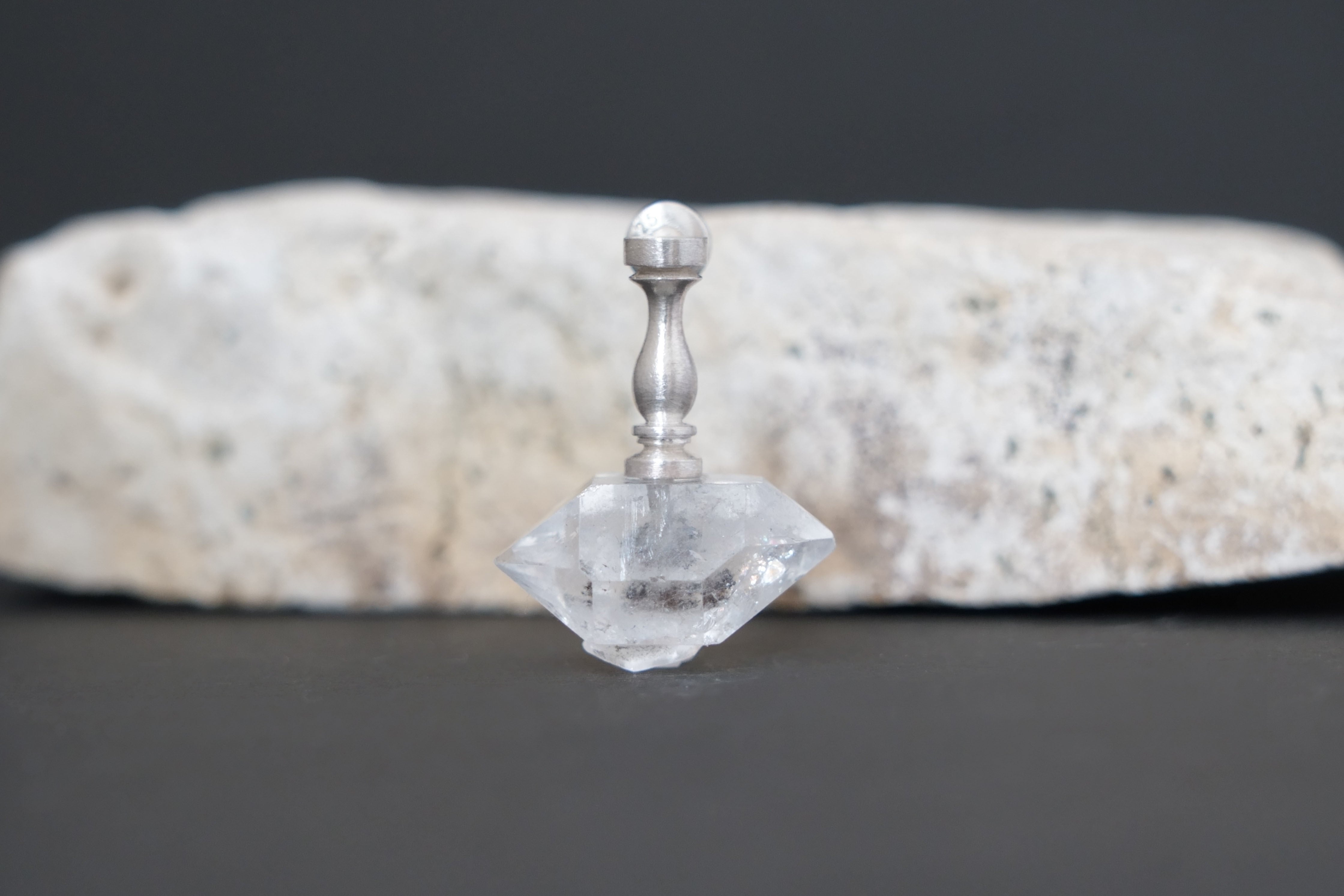 こちらはパキスタンで産出された両錐型の結晶ですがハーキマーダイヤモンドに劣らぬ透明度と品質のためパキスタンハーキマーと呼ばれています。内部に見える黒い物はカーボン(炭素)です。内包物を様々な角度から楽しめるのも魅力です。